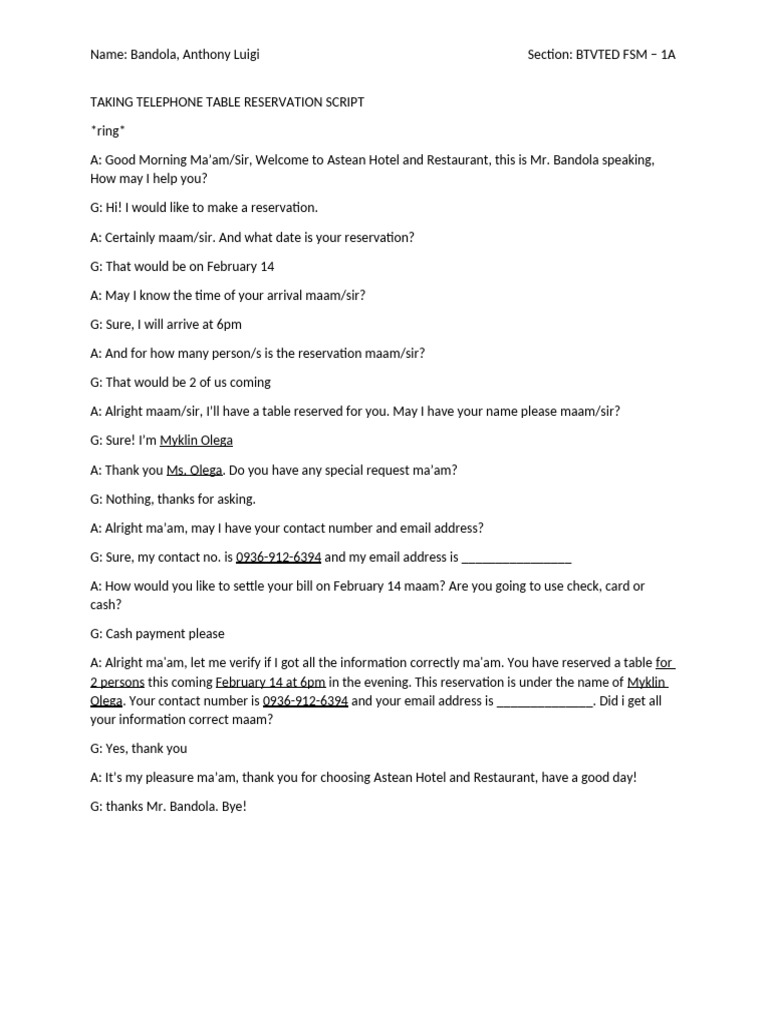 TAKING TELEPHONE TABLE RESERVATION SCRIPT