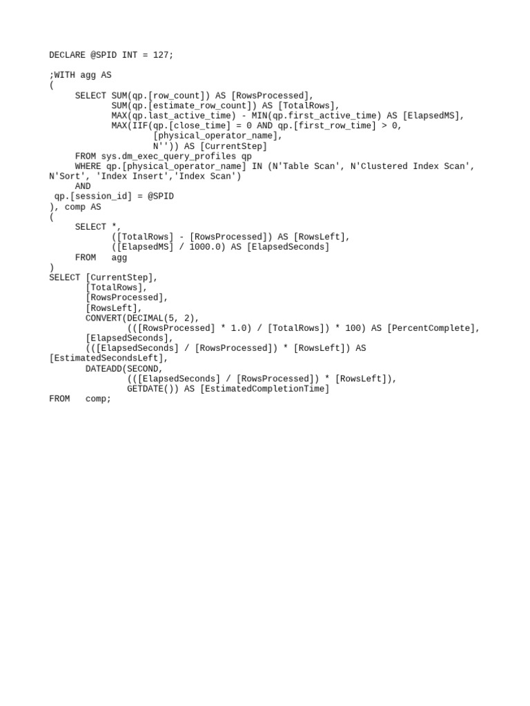 (([RowsProcessed] * 1.0) / [TotalRows]) * 100) AS [PercentComplete],