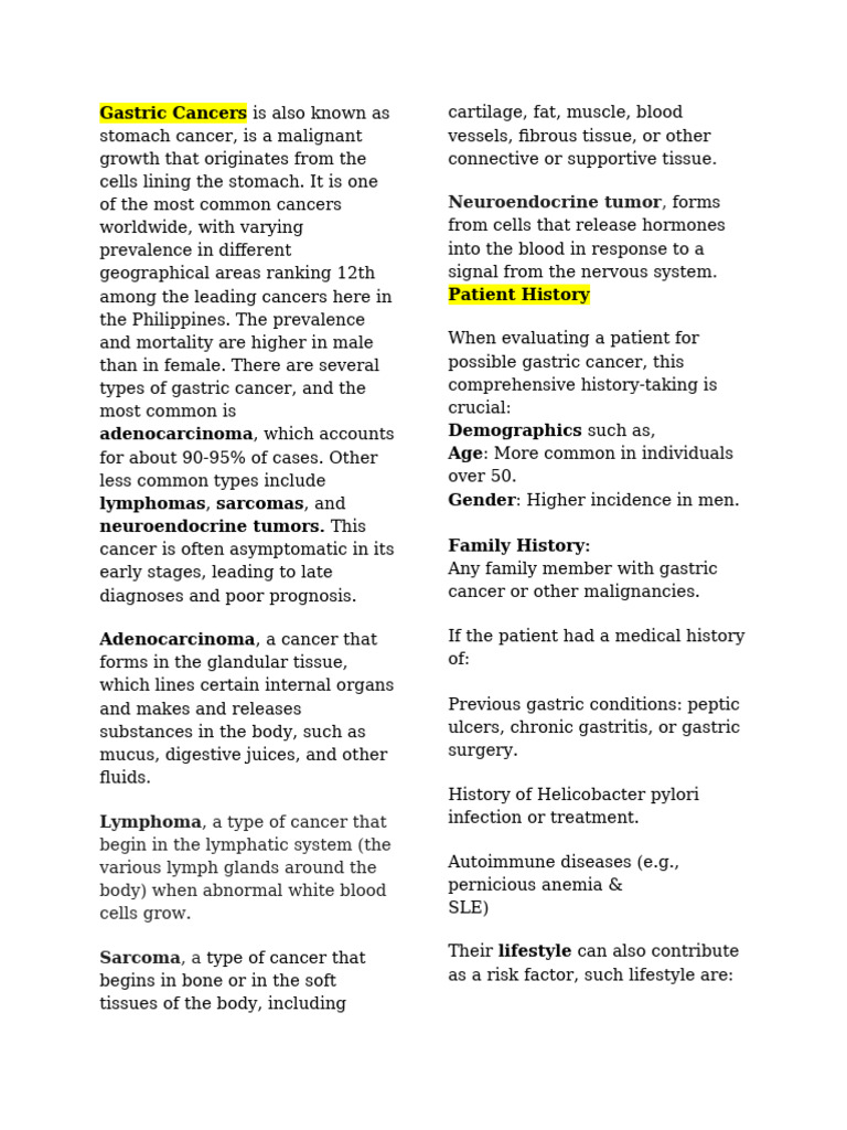types of gastric cancer, and the comprehensive history-taking is