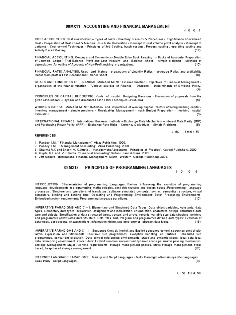 COST ACCOUNTING Cost classification Types of costs - Inventory Records & Procedures - Significance of overhead Cost - Preparation of Cost sheet & Machine Hour Rate Calculation - Concept of cost volume profit analysis - Concept of variance - Cost control Techniques - Principles of Job Costing, batch costing , Process costing , operating costing and Activity Based Costing. (12) FINANCIAL ACCOUNTING: Concepts and Conventions- Double Entry Book keeping -- Books of Accounts- Preparation of Journals, Ledger, Trial Balance, Profit and Loss Account and Balance sheet - simple problems - Methods of depreciation- An outline of Accounts of Non-Profit making organizations. (15) FINANCIAL RATIO ANALYSIS: Uses and Nature - preparation of Liquidity Ratios - coverage Ratios and profitability Ratios from profit & Loss Account and Balance sheet. (8) GOALS AND FUNCTIONS OF FINANCIAL MANAGEMENT: Finance function - objectives of Financial Management organisation of the finance function Various sources of Finance Dividend Determinants of Dividend Policy. (4) PRINCIPLES OF CAPITAL BUDGETING: Kinds of capital Budgeting Decisions - Evaluation of proposals from the given cash inflows Payback and discounted cash Flow Techniques Problems. (6) WORKING CAPITAL MANAGEMENT: Definition and importance of working capital - factors affecting working capital Inventory management - simple problems - Receivables Management - cash Budget Preparation - working capital Estimation. (6) INTERNATIONAL FINANCE: International Business methods Exchange Rate Mechanism Interest Rate Parity (IRP) and Purchasing Power Parity (PPP) Exchange Rate Risks Currency Derivatives - Simple Problems. (5) L: 56 REFERENCES 1. 2. 3. 4. 5. Pandey I.M , Financial Management Vikas Publishing, 1999. Pandey I.M. , Management Accounting Vikas Publishing, 2000. Sharma R.K and Shashi V. [Link] , Management Accounting Principles of Practice, Kalyani Publishers, 2000 Gupta R.L and [Link] , Financial Accounting Sultan Chand & Sons, 2001. Jeff Madura, International Financial Management South - Western College Publishing, 2001. Total : 56