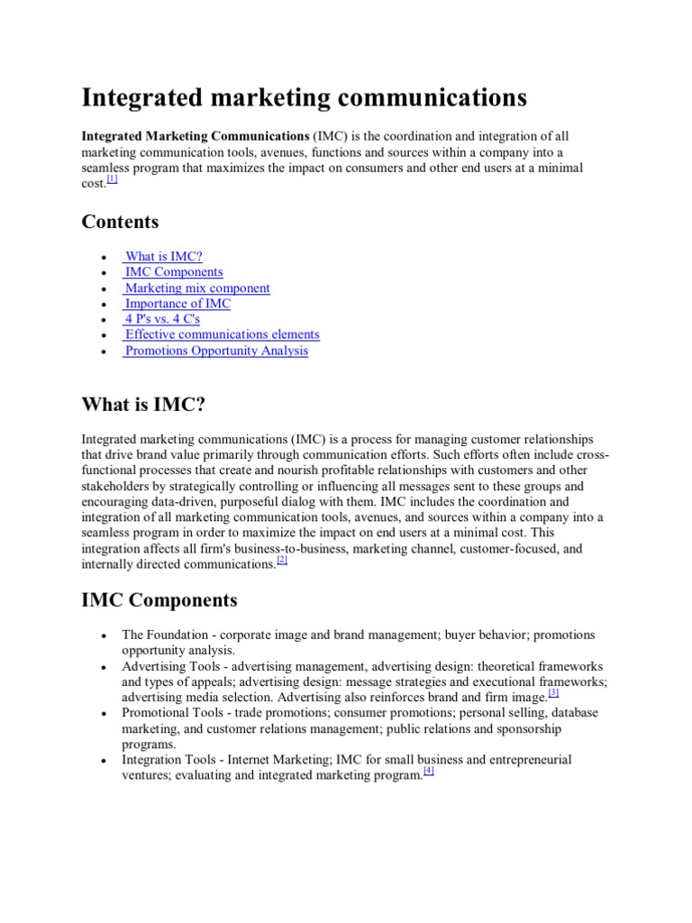 Integrated Marketing Communications (IMC) is the coordination and integration of all marketing communication tools, avenues, functions and sources within a company into a seamless program that maximizes the impact on consumers and other end users at a minimal cost.[1]