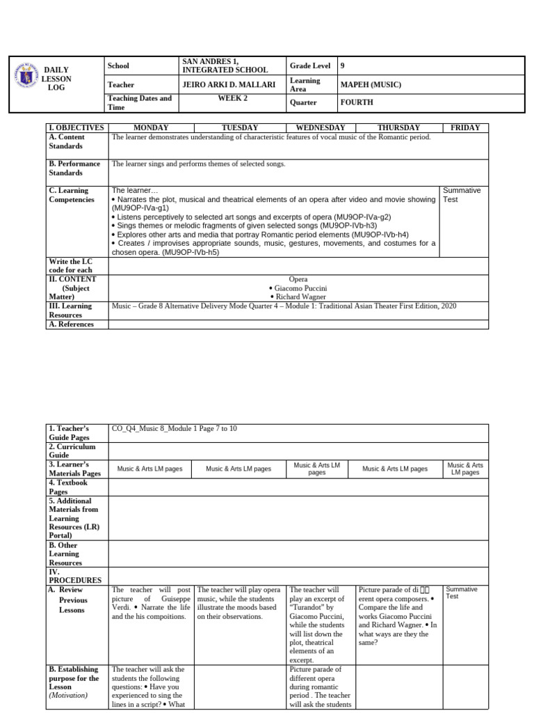 LOG Teacher JEIRO ARKI D. MALLARI MAPEH (MUSIC)
