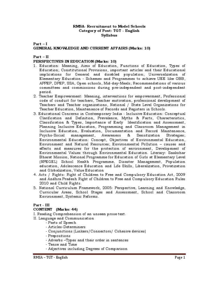 S (Marks: 10) Part II PERSPECTIVES IN EDUCATION (Marks: 10) 1. Education: Meaning, Aims of Education, Functions of Education, Types of Education; Constitutional Provisions, important articles and their Educational implications for General and disabled population; Universalization of Elementary Education - Schemes and Programmes to achieve UEE like OBB, APPEP, DPEP, SSA, Open schools, Mid-day-Meals; Recommendations of various committees and commissions during pre-independent and post-independent period. 2. Teacher Empowerment: Meaning, interventions for empowerment, Professional code of conduct for teachers, Teacher motivation, professional development of Teachers and Teacher organizations, National / State Level Organizations for Teacher Education, Maintenance of Records and Registers in Schools. 3. Educational Concerns in Contemporary India : Inclusive Education: Conceptual Clarification and Definition, Prevalence, Myths & Facts, Characteristics, Classification & Types, Importance of Early Identification and Assessment, Planning Inclusive Education, Programming and Classroom Management in Inclusive Education, Evaluation, Documentation and Record Maintenance, Psycho-Social management, Awareness & Sensitization Strategies; Environmental Education: Concept, Objectives of Environmental Education, Environment and Natural Resources; Environmental Pollution causes and effects and measures for the protection of environment, Development of Environmental Values through Environmental Education. Literacy: Saakshar Bharat Mission, National Programme for Education of Girls at Elementary Level (NPEGEL) School Health Programme, Disaster Management, Population education, Adolescence Education and Life Skills, Liberalization, Privatization and Globalization, Value Education 4. Acts / Rights: Right of Children to Free and Compulsory Education Act, 2009 and Andhra Pradesh Right of Children to Free and Compulsory Education Rules 2010 and Child Rights. 5. National Curriculum Framework, 2005: Perspective, Learning and Knowledge, Curricular Areas, School Stages and Assessment, School and Classroom Environment, Systemic Reforms. Part - III CONTENT (Marks: 44) I. Reading Comprehension of an unseen prose text. II. Language and Communication - Parts of Speech - Articles-Determiners - Conjunctions (Linkers/Connectors/ Cohesive devices) - Prepositions - Adverbs Types and their order in sentences - Tense and Time - Adjectives including Degrees of Comparison RMSA TGT - English Page 1