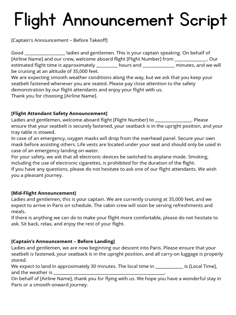 Ladies and gentlemen, welcome aboard flight [Flight Number] to _________________. Please