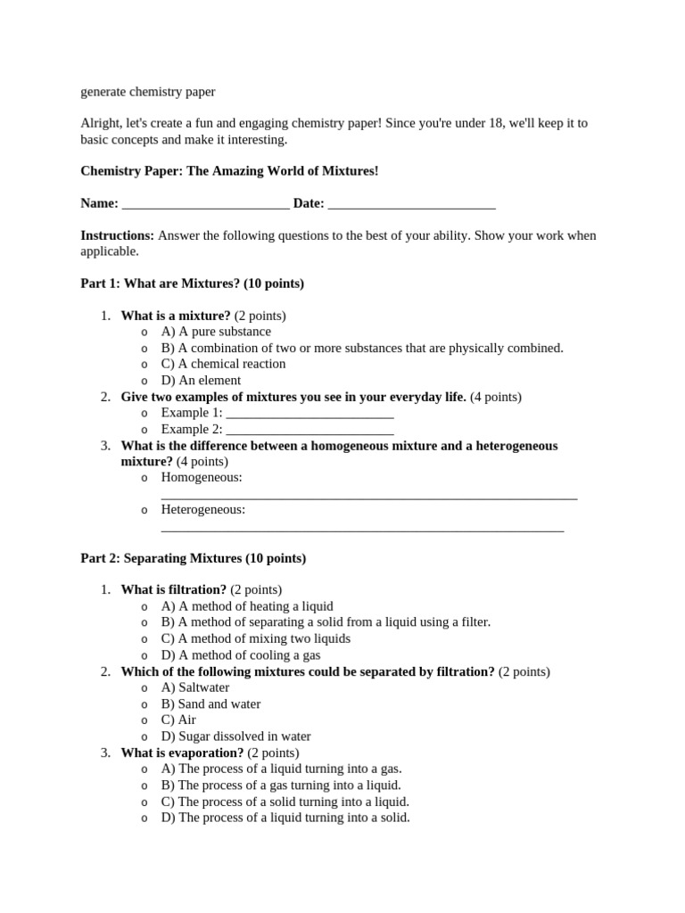 Alright, let's create a fun and engaging chemistry paper! Since you're under 18, we'll keep it to