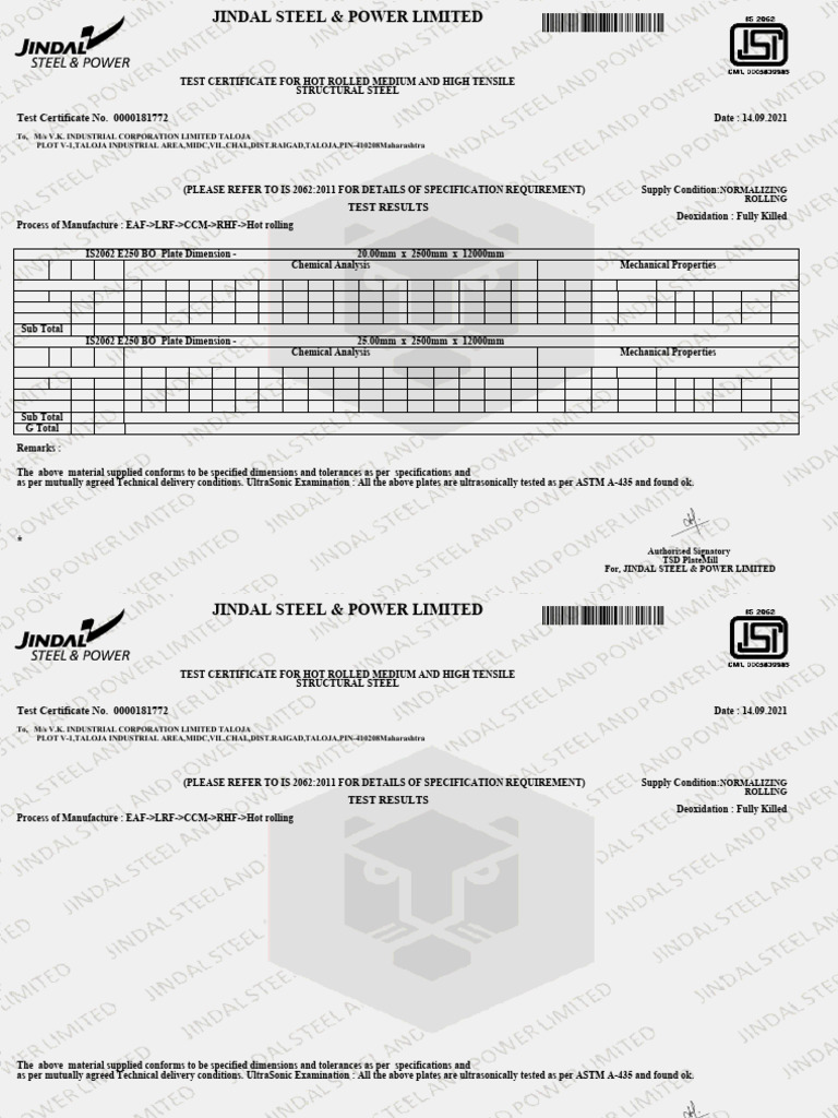 2. Material mentioned above also conforms to EN10025-2S355J0+N :2005 & IS2062 Gr E350 B0:2011.