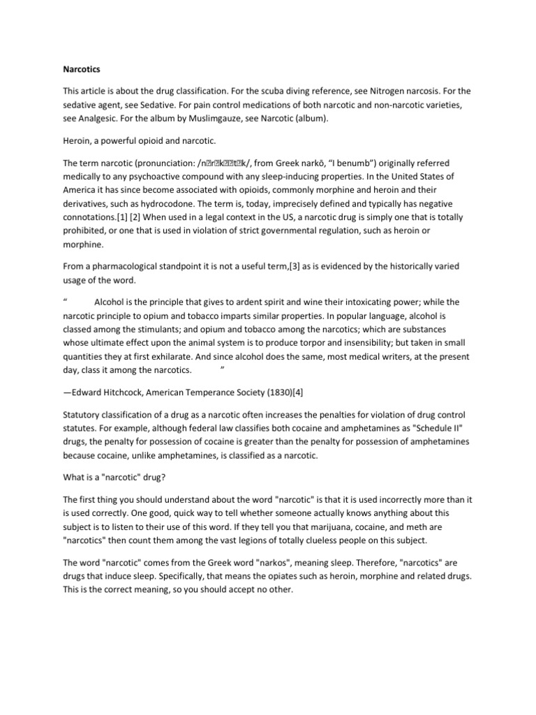 For the sedative agent, see Sedative. For pain control medications of both narcotic and non-narcotic varieties, see Analgesic. For the album by Muslimgauze, see Narcotic (album). Heroin, a powerful opioid and narcotic. The term narcotic (pronunciation: /n r k t k/, from Greek nark , benumb ) originally referred medically to any psychoactive compound with any sleep-inducing properties. In the United States of America it has since become associated with opioids, commonly morphine and heroin and their derivatives, such as hydrocodone. The term is, today, imprecisely defined and typically has negative connotations.[1] [2] When used in a legal context in the US, a narcotic drug is simply one that is totally prohibited, or one that is used in violation of strict governmental regulation, such as heroin or morphine. From a pharmacological standpoint it is not a useful term,[3] as is evidenced by the historically varied usage of the word. Alcohol is the principle that gives to ardent spirit and wine their intoxicating power; while the narcotic principle to opium and tobacco imparts similar properties. In popular language, alcohol is classed among the stimulants; and opium and tobacco among the narcotics; which are substances whose ultimate effect upon the animal system is to produce torpor and insensibility; but taken in small quantities they at first exhilarate. And since alcohol does the same, most medical writers, at the present day, class it among the narcotics. Edward Hitchcock, American Temperance Society (1830)[4] Statutory classification of a drug as a narcotic often increases the penalties for violation of drug control statutes. For example, although federal law classifies both cocaine and amphetamines as "Schedule II" drugs, the penalty for possession of cocaine is greater than the penalty for possession of amphetamines because cocaine, unlike amphetamines, is classified as a narcotic. What is a "narcotic" drug? The first thing you should understand about the word "narcotic" is that it is used incorrectly more than it is used correctly. One good, quick way to tell whether someone actually knows anything about this subject is to listen to their use of this word. If they tell you that marijuana, cocaine, and meth are "narcotics" then count them among the vast legions of totally clueless people on this subject. The word "narcotic" comes from the Greek word "narkos", meaning sleep. Therefore, "narcotics" are drugs that induce sleep. Specifically, that means the opiates such as heroin, morphine and related drugs. This is the correct meaning, so you should accept no other.