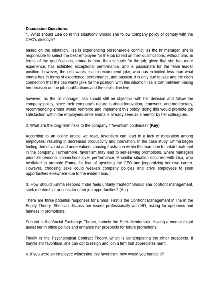 4. If you were an employee witnessing this favoritism, how would you handle it?