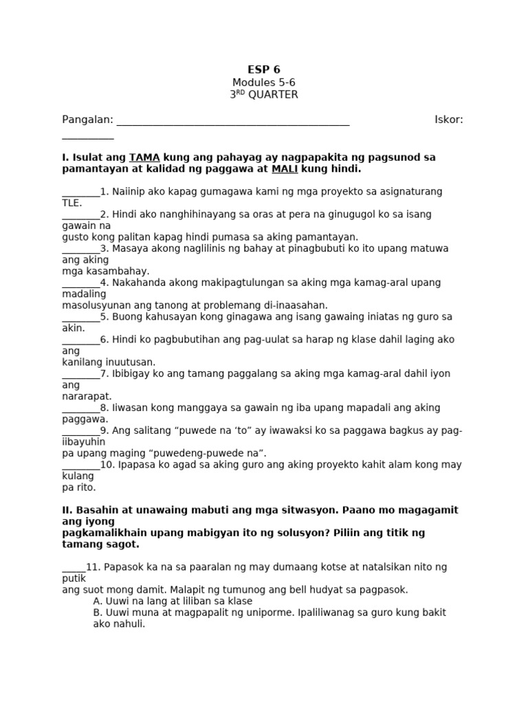 I. Isulat ang TAMA kung ang pahayag ay nagpapakita ng pagsunod sa