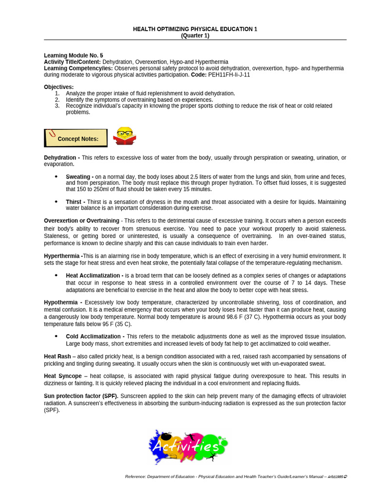 Learning Competency/ies: Observes personal safety protocol to avoid dehydration, overexertion, hypo- and hyperthermia