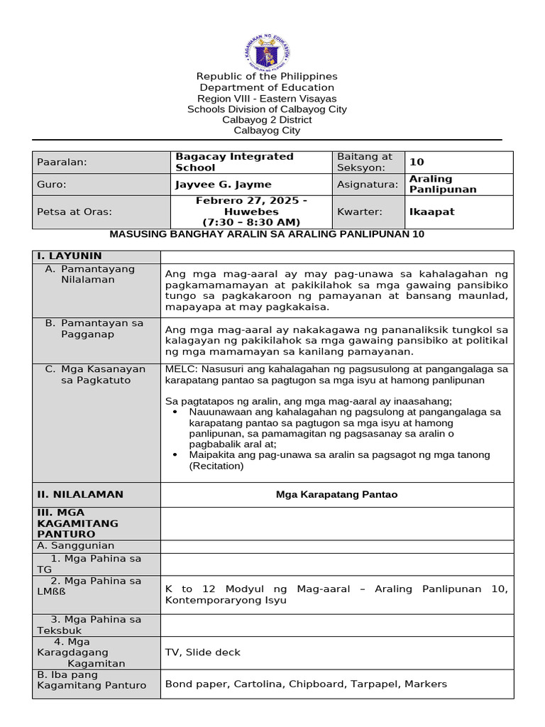 MASUSING BANGHAY ARALIN SA ARALING PANLIPUNAN 10