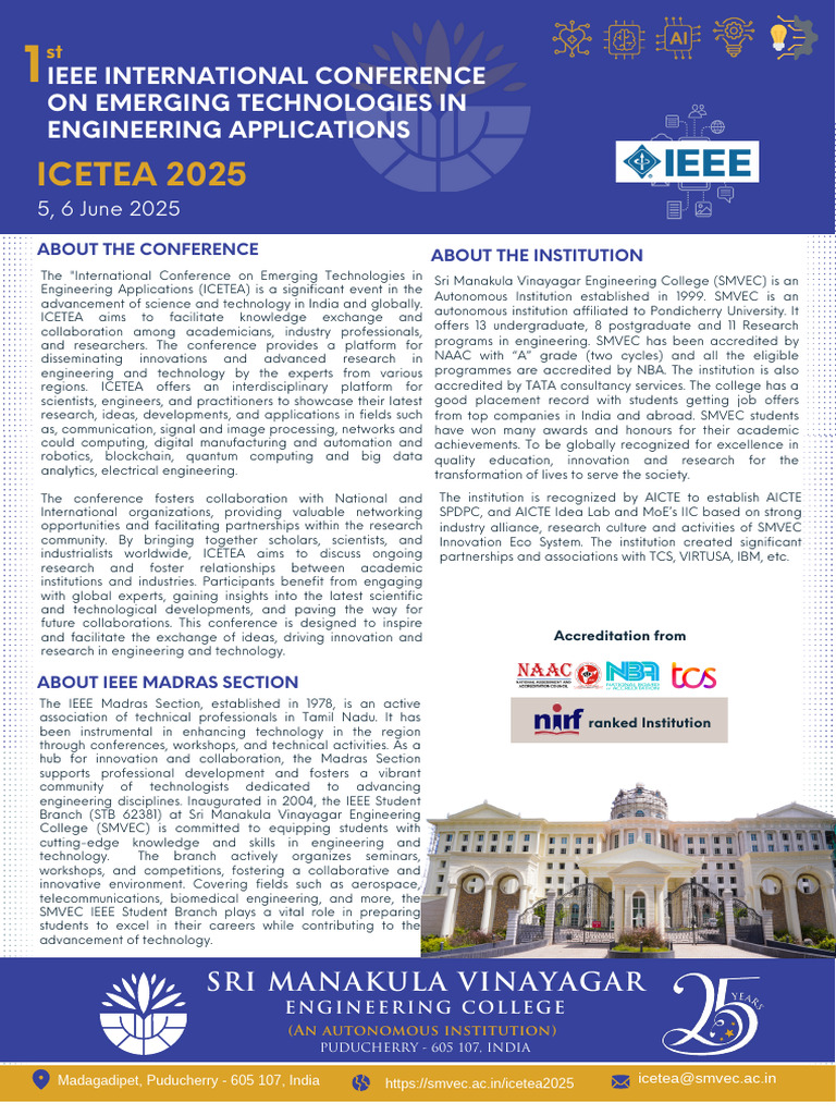 The "International Conference on Emerging Technologies in Sri Manakula Vinayagar Engineering College (SMVEC) is an