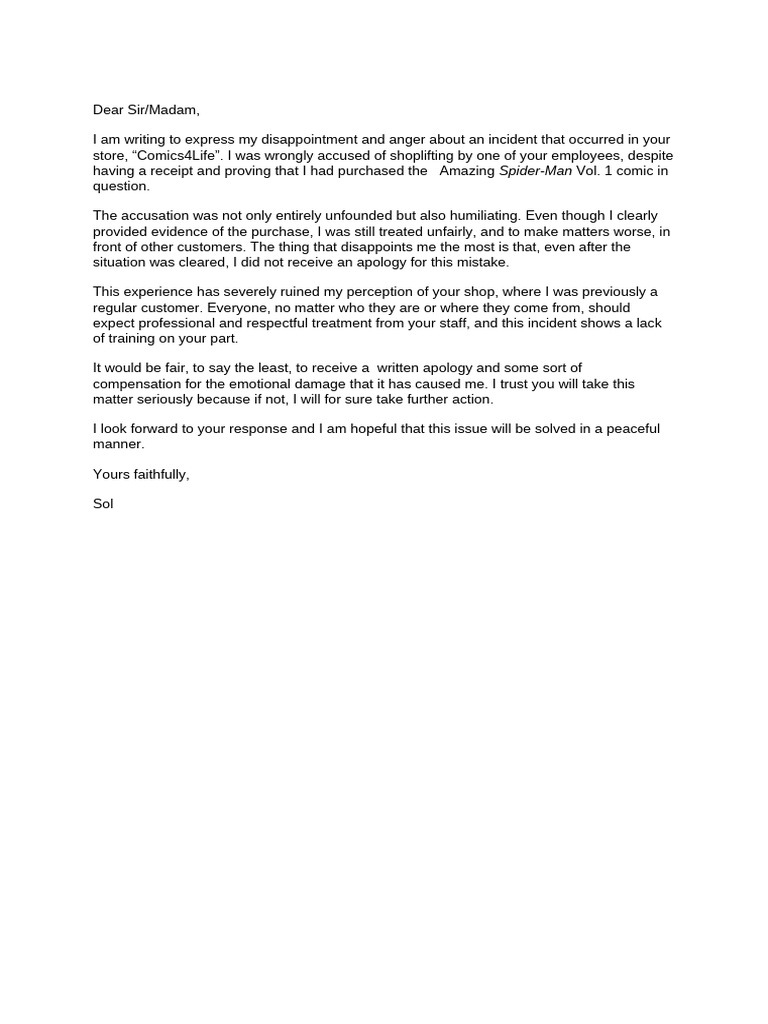 store, “Comics4Life”. I was wrongly accused of shoplifting by one of your employees, despite