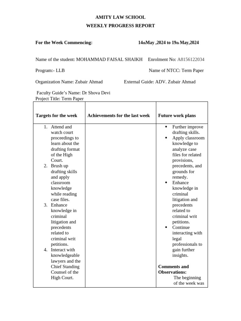 Targets for the week Achievements for the last week Future work plans