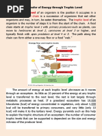 flows throught the system from an effiecieny point of view once more. When we follow the path of energy from the initial rays of sunlight right through to the top carnivore, we find that the rule of thumb known as the 1%/10% rule applies. Figure 3.3 Hypothetical example of a food chain showing the approximate percentage of energy that is transferred between each link in the chain. Food chains depict the shortest chain in an ecosystem with the average length of a food chain being about 4 or 5 trophic levels long. This rule states, firstly, that of all the sunlight that falls on the Earth, only 1% is used by primary producers. Secondly, only 10% of the primary biomass is used by primary consumers, and only 10% of that energy is used by secondary consumers etcetera. The trend in energy reduction is linear (in the sense that it is not cyclic) between the trophic layers, yet approaches a somewhat logarithmic or exponential decay pattern in the loss between each trohic layer. Overall, the transfer of energy through the environment is not very efficient which is in perfect accordance with the Second Law. Efficiency is related to many other factors and is very much dependant upon the type of ecosystem in question. Food chains (which were first decribed by Elton in 1927) are often depicted graphically, as seen in the Figure 3.3 above, which is a simple food chain for a grassland. Food chains are used to depict the depth (or length) of the ecosystems trophic structure (layers) and are usually quite short with maximum chainlengths of between 5 and 8. The food chain stops when there is insufficient energy to maintain another trophic layer, which may be brought about by two possible mechanisms; the intial quality of primary productivity, or by the effectiveness of the Lindeman efficiencies in the secondary productivity stage of the ecosystem, at this stage though, ecologist are not certain how the length of a food chain is controlled.