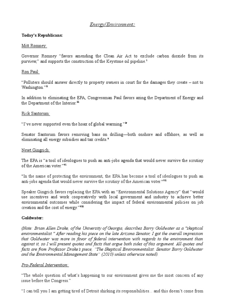 Today's Republicans: Mitt Romney: Governor Romney favors amending the Clean Air Act to exclude carbon dioxide from its purview, and supports the construction of the Keystone oil pipeline. i Ron Paul: Polluters should answer directly to property owners in court for the damages they create not to Washington.ii In addition to eliminating the EPA, Congressman Paul favors axing the Department of Energy and the Department of the Interior. iii Rick Santorum: Ive never supported even the hoax of global warming. iv Senator Santorum favors removing bans on drillingboth onshore and offshore, as well as eliminating all energy subsidies and tax credits. v Newt Gingrich: The EPA is a tool of ideologues to push an anti-jobs agenda that would never survive the scrutiny of the American voter. vi "In the name of protecting the environment, the EPA has become a tool of ideologues to push an anti-jobs agenda that would never survive the scrutiny of the American voter." vii Speaker Gingrich favors replacing the EPA with an Environmental Solutions Agency that would use incentives and work cooperatively with local government and industry to achieve better environmental outcomes while considering the impact of federal environmental policies on job creation and the cost of energy. viii Goldwater: (Note: Brian Allen Drake, of the University of Georgia, describes Barry Goldwater as a "skeptical environmentalist." After reading his piece on the late Arizona Senator, I got the overall impression that Goldwater was more in favor of federal intervention with regards to the environment than against it, so I will present quotes and facts that argue both sides of this argument. All quotes and facts are from Professor Drakes piece, The Skeptical Environmentalist: Senator Barry Goldwater and the Environmental Management State (2010) unless otherwise noted). Pro-Federal Intervention: The whole question of whats happening to our environment gives me the most concern of any issue before the Congress. I can tell you I am getting tired of Detroit shirking its responsibilities... and this doesnt come from