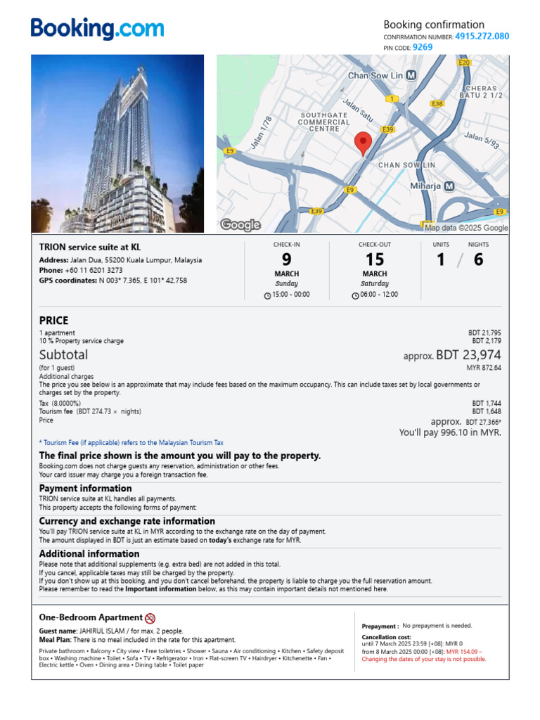 This print version of your confirmation contains the most important information about your booking. It can be used to check in when you arrive at TRION service suite at KL. For