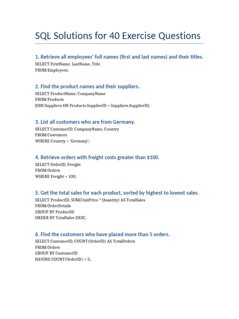 SQL Solutions for 40 Exercise Questions