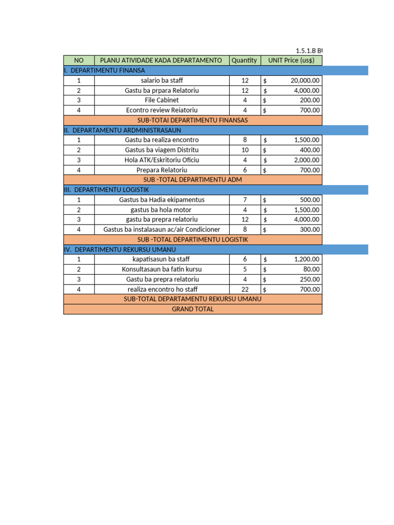 NO PLANU ATIVIDADE KADA DEPARTAMENTO Quantity UNIT Price (us$)