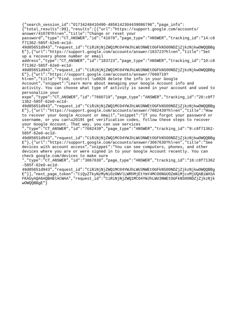 {"total_results":99},"results":[{"url":"[Link] answer/41078?hl=en","title":"Change or reset your password","type":"CT_ANSWER","id":"41078","page_type":"ANSWER","tracking_id":"14:c8 f71362-585f-62e0-ec1d- 49d85651d943","request_id":"CiRiNjNjZWQ1MC04YWJhLWU3NWEtOGFkNS00NDZjZjkzNjkwOWQQBBg E"},{"url":"[Link] up a recovery phone number or email address","type":"CT_ANSWER","id":"183723","page_type":"ANSWER","tracking_id":"10:c8 f71362-585f-62e0-ec1d- 49d85651d943","request_id":"CiRiNjNjZWQ1MC04YWJhLWU3NWEtOGFkNS00NDZjZjkzNjkwOWQQBBg E"},{"url":"[Link] hl=en","title":"Find, control \u0026 delete the info in your Google Account","snippet":"Learn more about managing your Google Account info and activity. You can choose what type of activity is saved in your account and used to personalize your expe","type":"CT_ANSWER","id":"7660719","page_type":"ANSWER","tracking_id":"20:c8f7 1362-585f-62e0-ec1d- 49d85651d943","request_id":"CiRiNjNjZWQ1MC04YWJhLWU3NWEtOGFkNS00NDZjZjkzNjkwOWQQBBg E"},{"url":"[Link] to recover your Google Account or Gmail","snippet":"If you forgot your password or username, or you can\u2019t get verification codes, follow these steps to recover your Google Account. That way, you can use services ","type":"CT_ANSWER","id":"7682439","page_type":"ANSWER","tracking_id":"9:c8f71362- 585f-62e0-ec1d- 49d85651d943","request_id":"CiRiNjNjZWQ1MC04YWJhLWU3NWEtOGFkNS00NDZjZjkzNjkwOWQQBBg E"},{"url":"[Link] devices with account access","snippet":"You can see computers, phones, and other devices where you are or were signed in to your Google Account recently. You can check [Link]/devices to make sure ","type":"CT_ANSWER","id":"3067630","page_type":"ANSWER","tracking_id":"16:c8f71362 -585f-62e0-ec1d- 49d85651d943","request_id":"CiRiNjNjZWQ1MC04YWJhLWU3NWEtOGFkNS00NDZjZjkzNjkwOWQQBBg E"}],"next_page_token":"CiQyZTkyNzMyNi0zOWVlLWRhMjEtYmY4MC00NGU0ZmNiMjcxMjUQABiWASA FKAUyAQA6AQBABlACWAA","request_id":"CiRiNjNjZWQ1MC04YWJhLWU3NWEtOGFkNS00NDZjZjkzNjk wOWQQBBgE"}