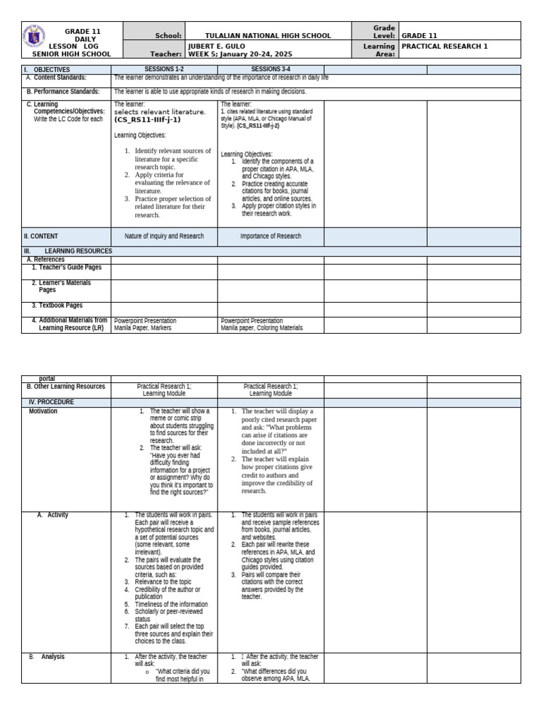 LESSON LOG JUBERT E. GULO Learning PRACTICAL RESEARCH 1