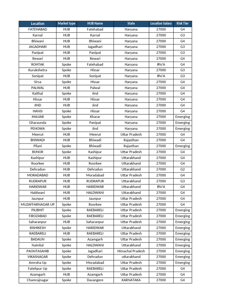 Location Market type HUB Name State Location Salary Risk Tier