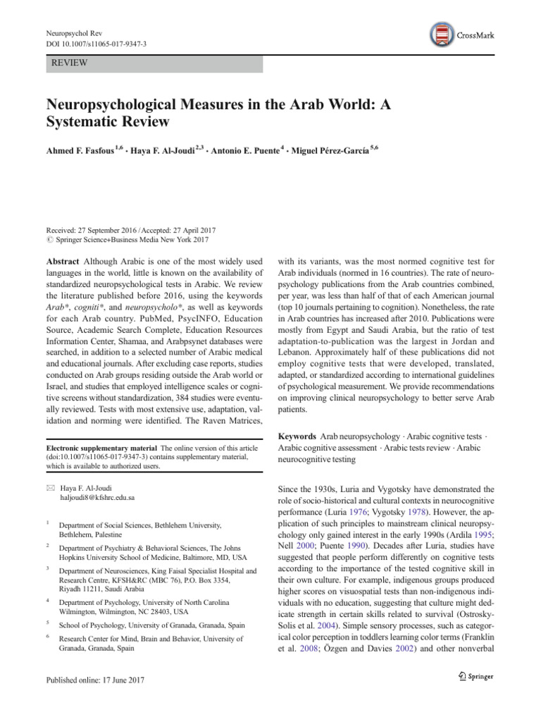 Electronic supplementary material The online version of this article Arabic cognitive assessment . Arabic tests review . Arabic