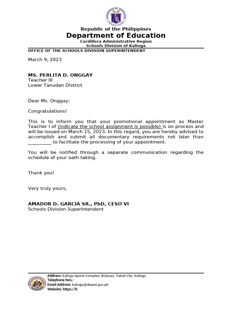Master Teacher 1 will be issued on the 15 th day March 2023. However, said