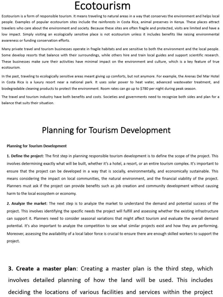 people. Examples of popular ecotourism sites include the rainforests in Costa Rica, animal preserves in Kenya. These places attract