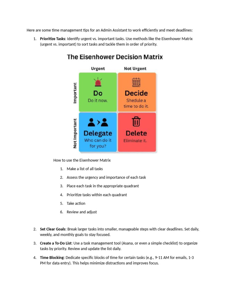 Here are some time management tips for an Admin Assistant to work efficiently and meet deadlines: