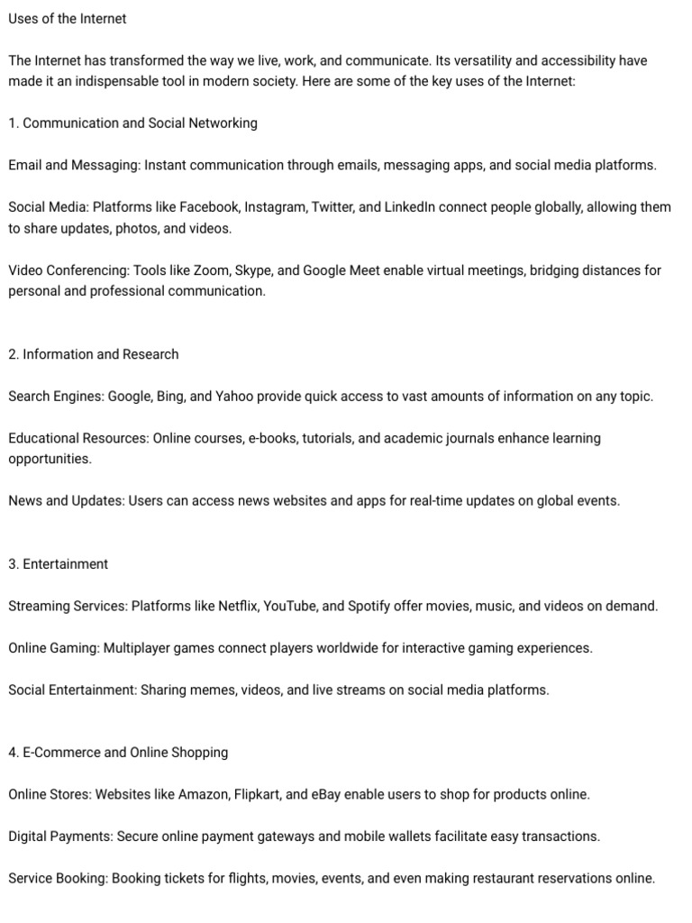 made it an indispensable tool in modern society. Here are some of the key uses of the Internet: