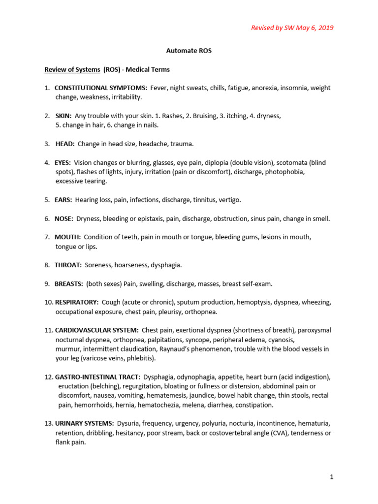 Review of Systems (ROS) - Medical Terms