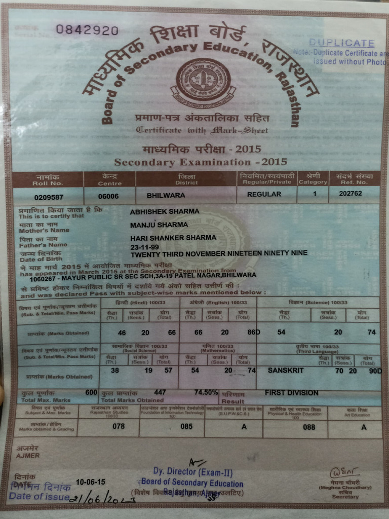 sharma, Mother Name - Smt manju sharma, permanent resident of 6G1, CSC