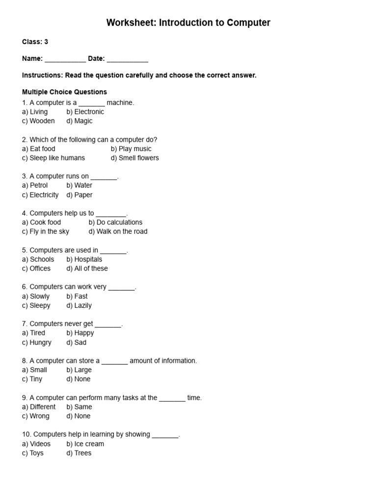 Worksheet: Introduction to Computer