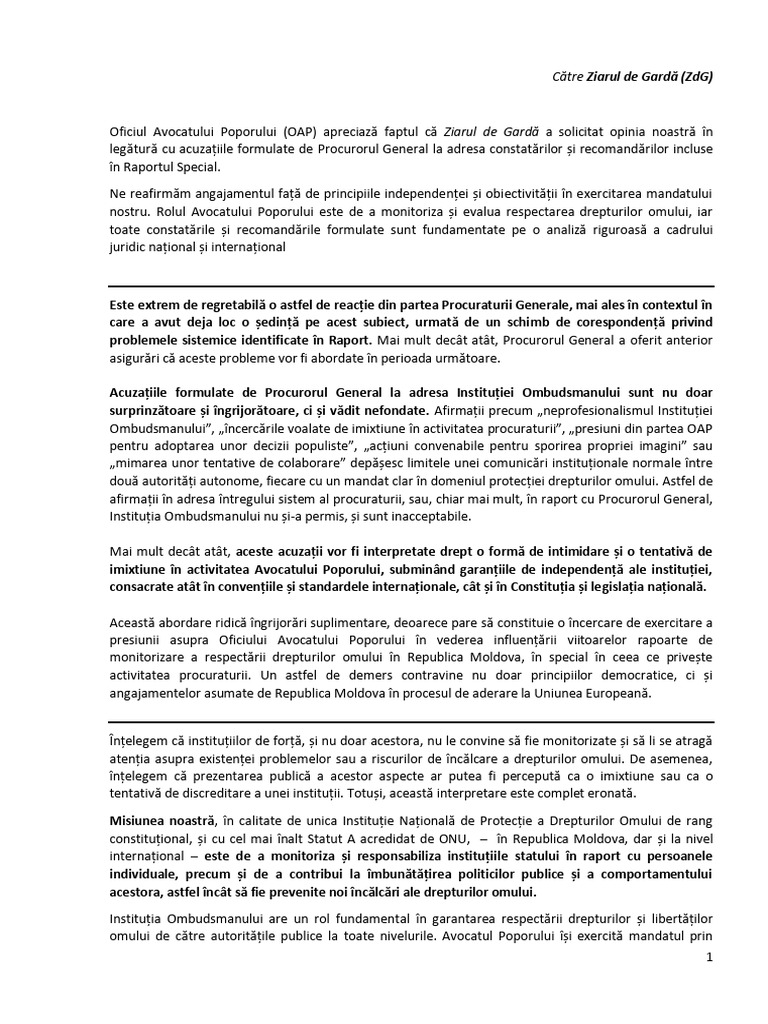 Oficiul Avocatului Poporului (OAP) apreciază faptul că Ziarul de Gardă a solicitat opinia noastră în