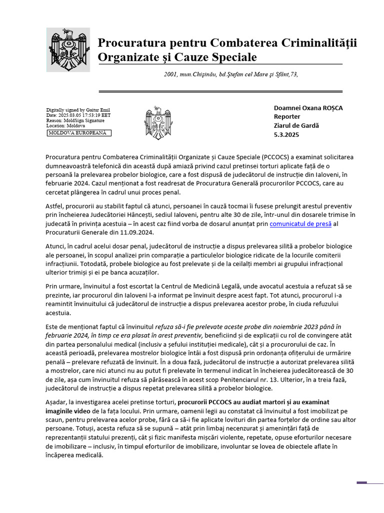 februarie 2024. Cazul menționat a fost readresat de Procuratura Generală procurorilor PCCOCS, care au
