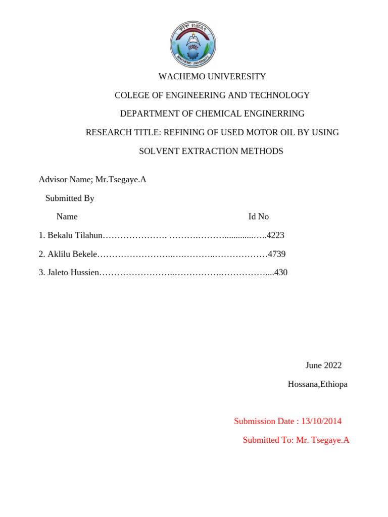This thesis work investigates refining of used lubricating motor oil using solvent extraction method.