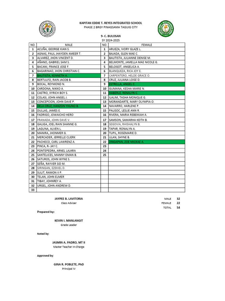 Grade 9 Class Roster SY 2024-2025