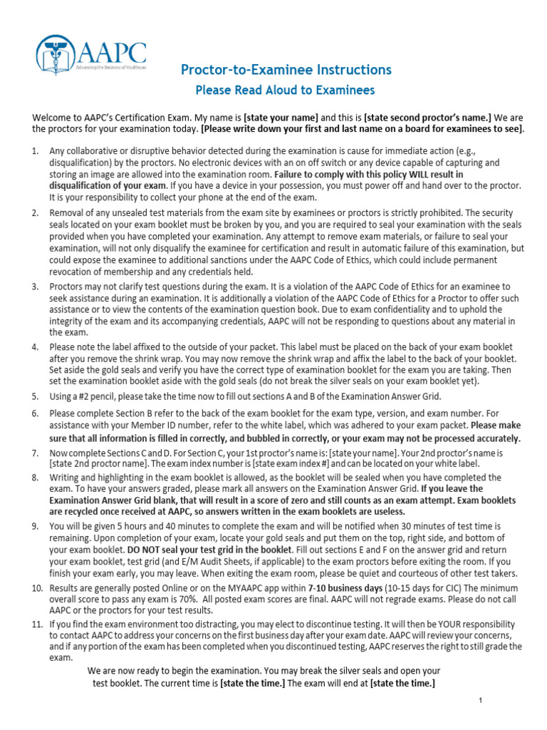 3. Proctors may not clarify test questions during the exam. It is a violation of the AAPC Code of Ethics for an examinee to