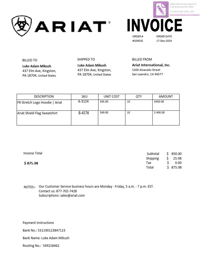 Luke Adam Mikush Luke Adam Mikush Ariat International, Inc.