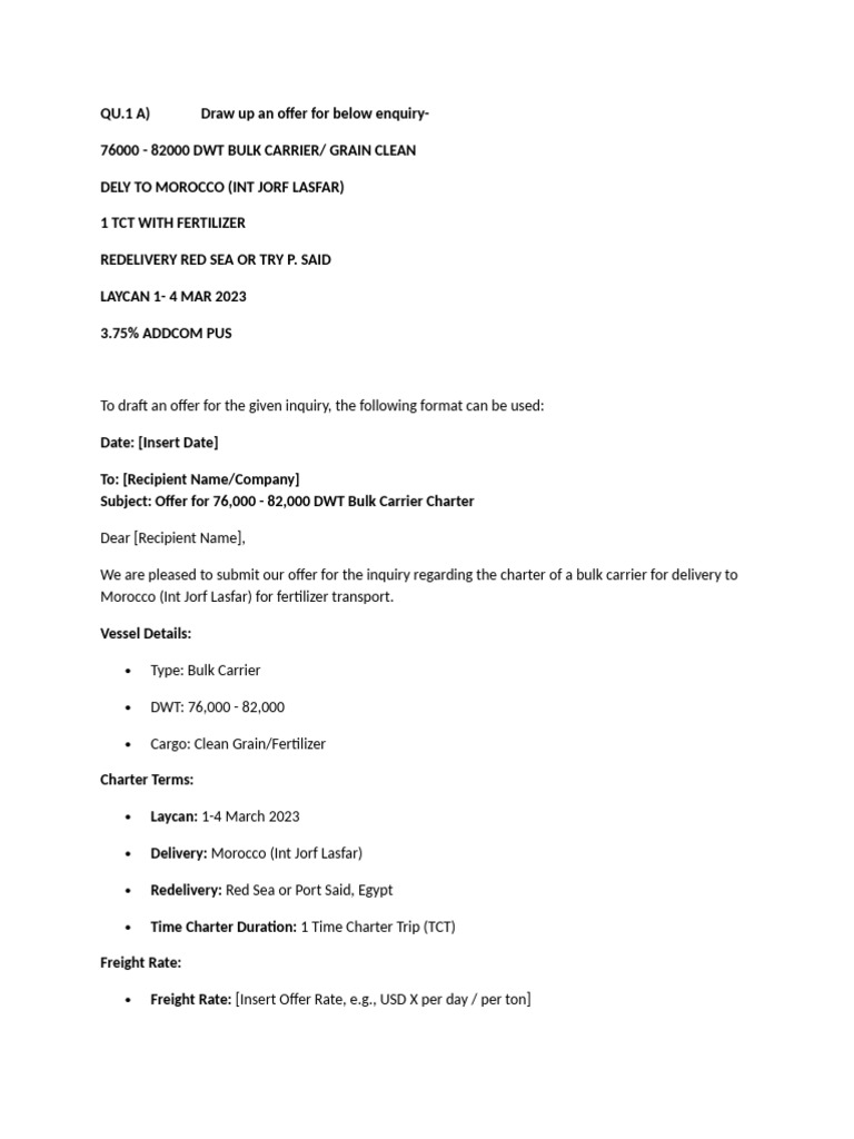 B) Draft a voyage firm offer on Owner's behalf for below cargo quote: