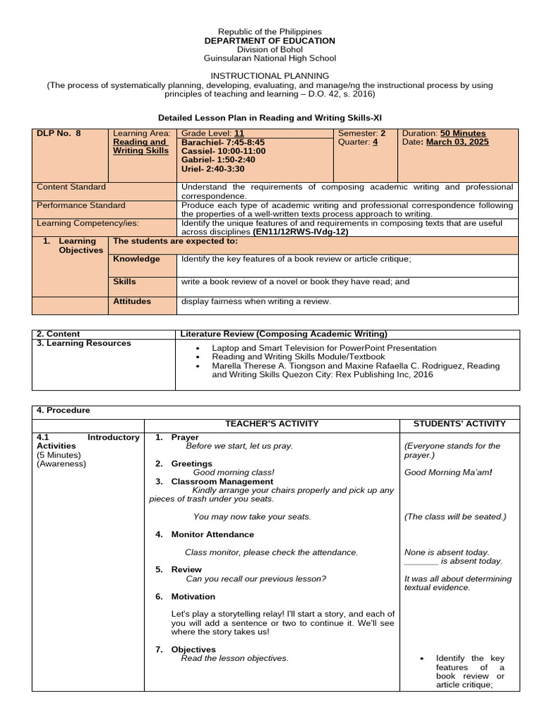 Reading and Barachiel- 7:45-8:45 Quarter: 4 Date: March 03, 2025