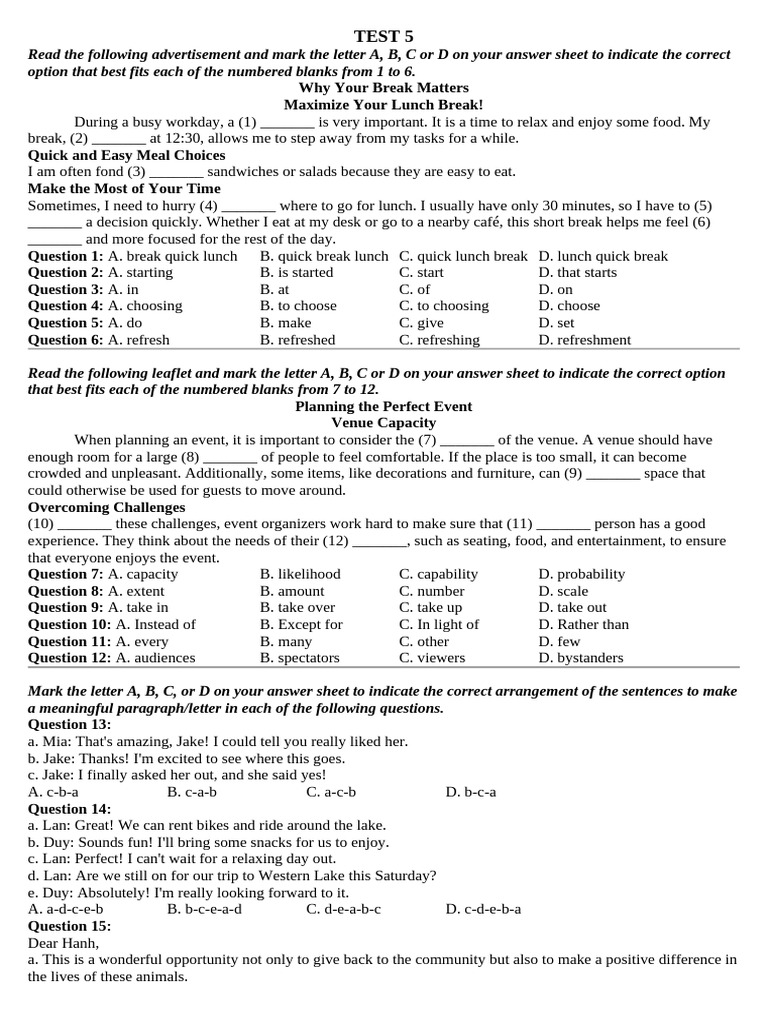Question 5: A. do B. make C. give D. set