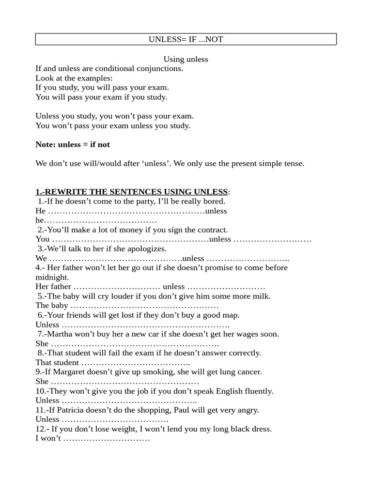 1.-REWRITE THE SENTENCES USING UNLESS: