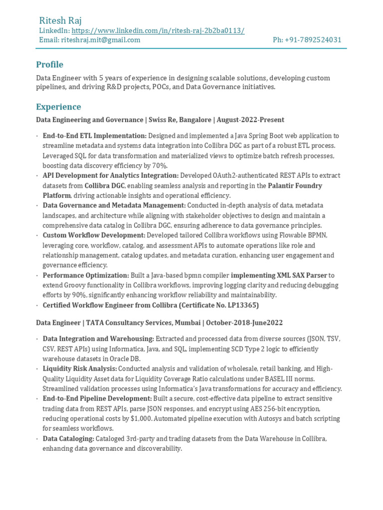 · Certified Workflow Engineer from Collibra (Certificate No. LP13365)
