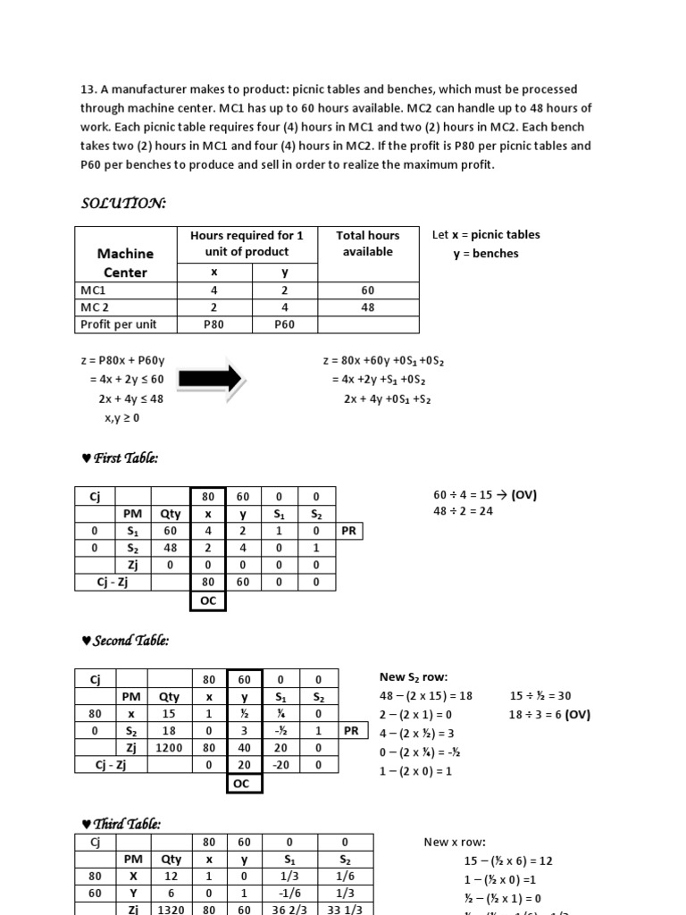 takes two (2) hours in MC1 and four (4) hours in MC2. If the profit is P80 per picnic tables and