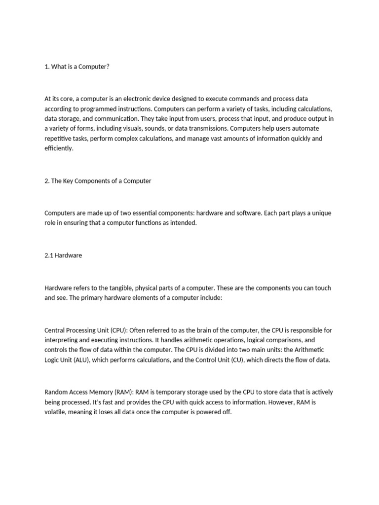 Computers are made up of two essential components: hardware and software. Each part plays a unique