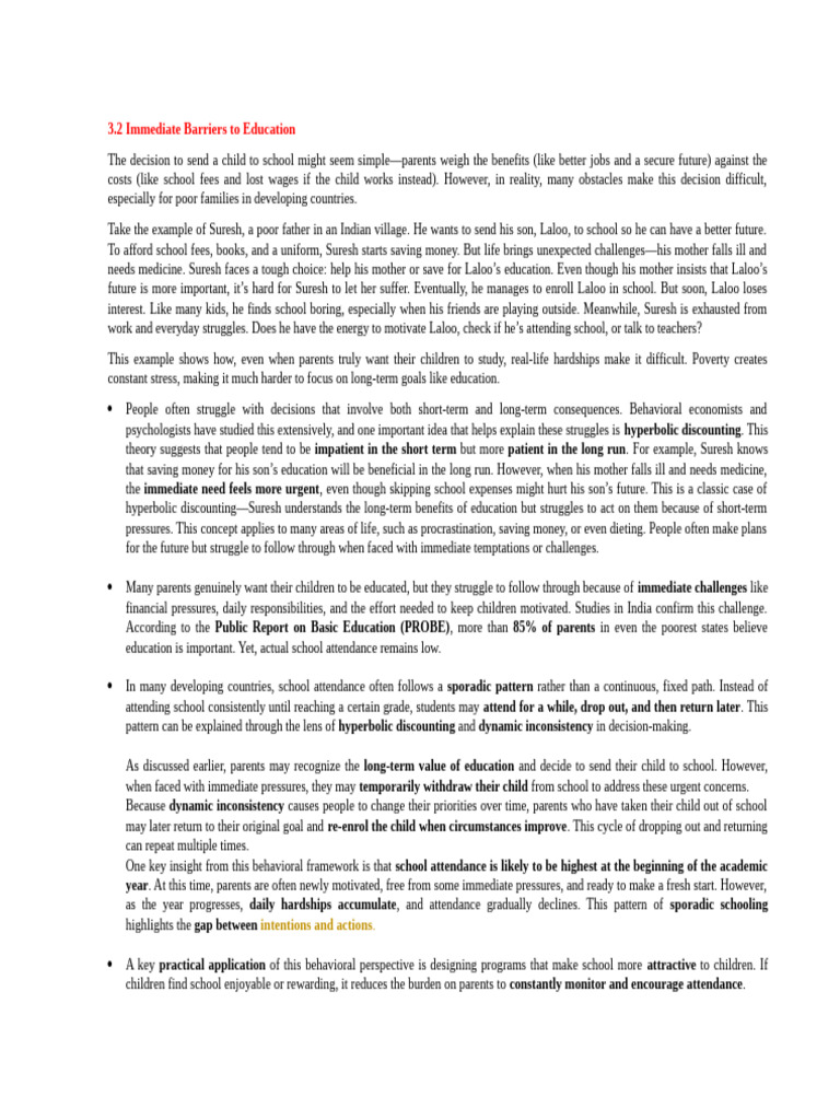 hyperbolic discounting—Suresh understands the long-term benefits of education but struggles to act on them because of short-term