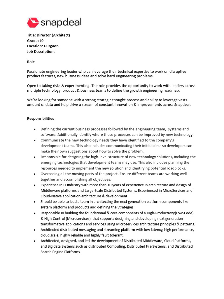 • Should be able to lead a team in architecting the next generation platform components like