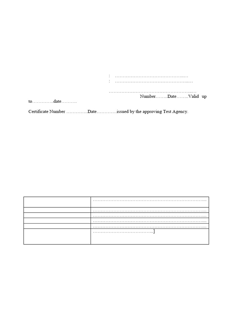 Certificate Number …………..Date………….issued by the approving Test Agency.